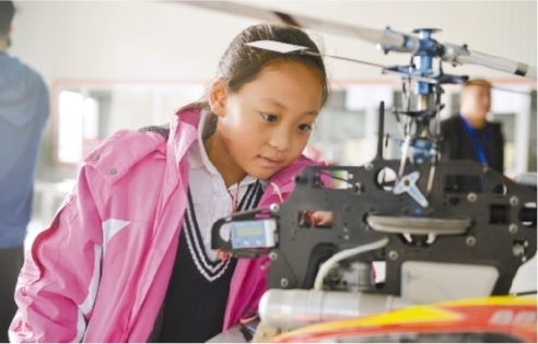 在2019年首届航空教育体验嘉年华上,小学生对无人机充满好奇