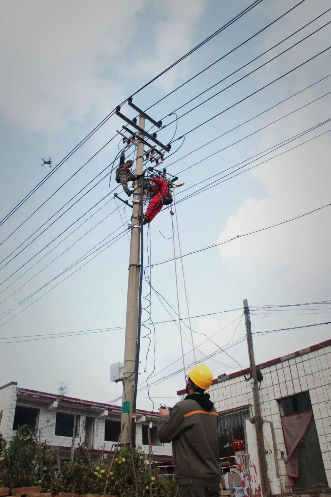 工作人员运用无人机进行巡线及登杆作业