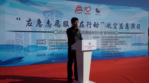 北京市应急管理局宣传动员处的谢汉明做了主题发言,并为北京市应急志愿服务总队航空支队授牌,且在演练结束后做了精彩点评。
