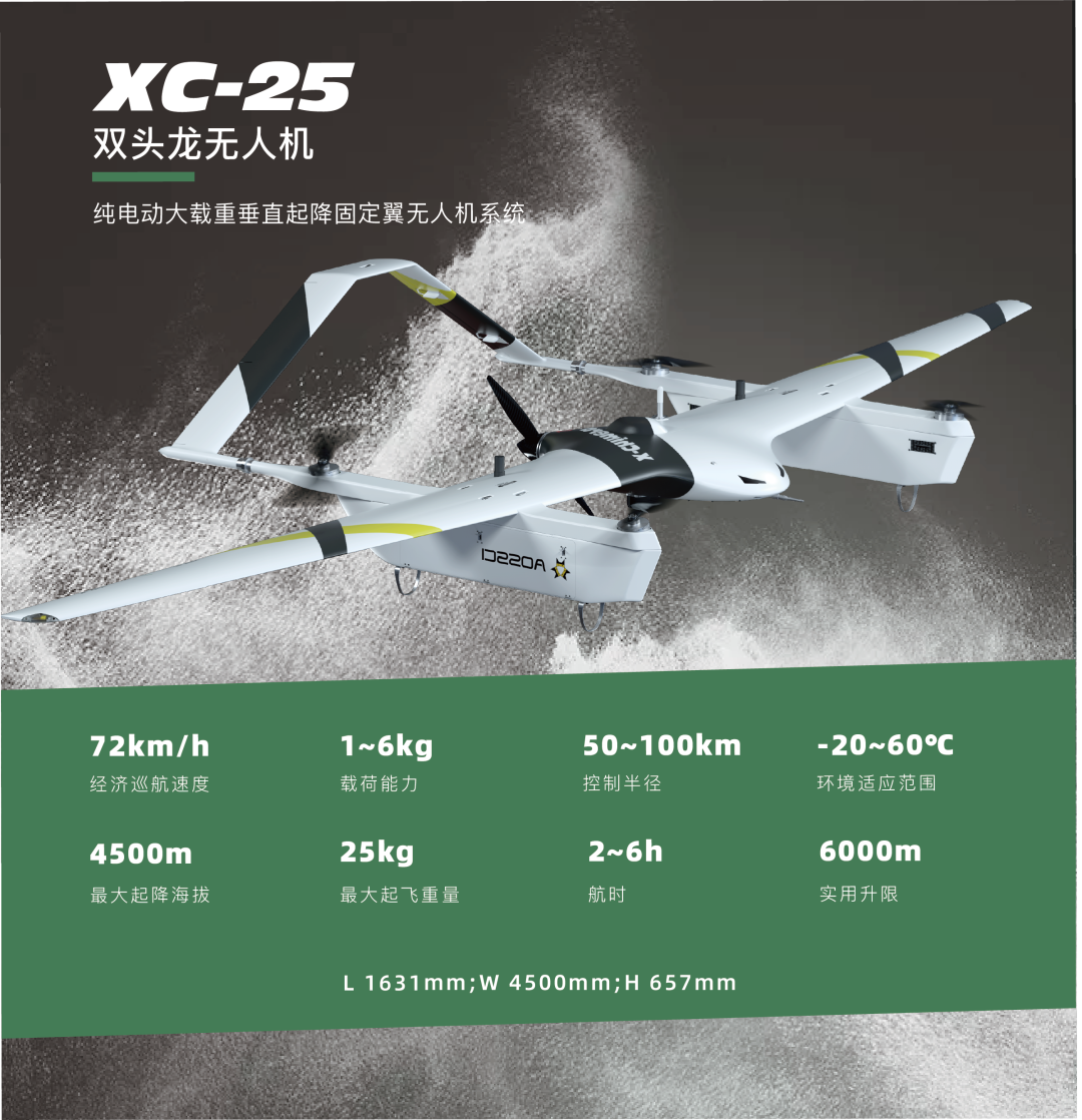 随着科技的快速发展,无人航测技术已广泛应用到测绘行业中,同时,对采集设备的稳定性、可靠性和精准性也提出了更高要求。傲势XC-25双头龙无人机,可携带1-6公斤载荷飞行2-6小时,飞机全系统3分钟内可完成装配,熟练飞手甚至可在1分05秒内完成组装,3分钟完成全套部署。目前XC-25双头龙无人机可搭载正摄相机、倾斜相机、激光雷达等多种测绘载荷,轻松实现全天候、高效率实时数据获取及复杂场景下三维实景建模,大幅提升测绘作业能力。