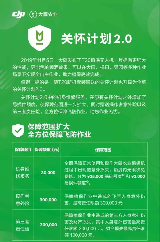 开始转型“服务授权”路线的竞争对手,也进入了渠道开拓阶段。不过,在这条路线上已探索2年多的大疆农业,已占据了领先位置。引入“全保”补齐费用短板2020年8月4号清晨6点天刚亮,安徽蚌埠丰盛农业装备公司的电话响了。电话那端飞手卓先生的植保机挂高压线了!还兑了很多药、一大堆田等着打!30分钟后,卓先生到达维修点,定损结果为保险维修。登记完申请备用机,卓先生继续作业,维修师则马上开工。通过肉眼定损的有前框、中框、脚架、电机固定座、SDR天线等,损坏超过15处。经过12小时“抢救”,植保机成功复活!整个过程全走保险,卓先生没有掏一分钱。费用,是大疆农业服务体系搭建的最后一块短板。植保机是生产力工具,降低维护费用,就是间接帮用户赚钱。维修费用还能怎么降?大疆农业的策略是保险+保修。2018年,大疆农业正式发布了植保机关怀计划。保障期限内,正常作业时非人为因素造成的损坏,维修费用都将由大疆承担。在这个关怀计划并不包含桨叶、水泵等易损件。维修时,用户仍需为这些部件买单。2020年T20发布后,全新版本的关怀计划加入了易损件额度。这也意味着,绝大多数的情况下,用户的维修费用都由大疆与保险来承担。这一政策又进一步降低了大疆植保机的维护成本。