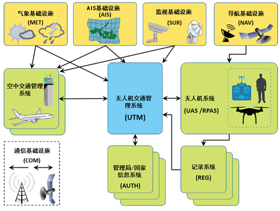 无人机交通管理系统可以为上述挑战提供突破性的解决方案。无人机数量的增加这一事实证明了特定管理系统存在的必要性。包括飞行与空中交通信息系统等已规划的解决方案必须具有多个信息管理功能,可支持完成相关飞行任务,以便有效管理总体航空交通(常规飞机和无人机)。无人机交通管理解决方案可能会通过提供新的信息管理运行系统来提高效率。无人机交通管理基于用户及其系统的协同,可定义为一种系统之系统(SoS),目的是保持无人机与常规空域用户之间的必要间隔,此外,还需要保持超低空(VLL)空域中的交通秩序。