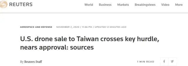 路透社刚刚援引消息人士话称,美国向台湾出售四架先进美制无人机已跨越国会一个“关键障碍”,目前正处于批准的最后阶段。