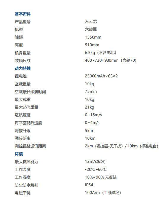 入云龙1550是一款工业级六旋翼无人机,机身碳纤维一体成型,重量极轻,机臂采用了渐变拔插结构,方便安全,整机达到防雨防尘性能,并有超强的负载能力,飞行时间可达一个小时以上。入云龙可搭载包括喊话器、红外像机、变焦相机、倾斜摄影系统等不同挂载,在复杂环境下为公安、消防、电力等不同行业提供服务。