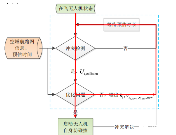 步骤二:更新航路网信息???? ,当前时刻 ???? ,所有已通过起飞授权的无人机信息 ???????? , ???? ∈ ????active 。对已通过起飞授权的无人机进行冲突检测,若有冲突无人机则输出发生冲突的无人机 ???????? ,collision和可能的冲突时间;否则执行步骤五 ;