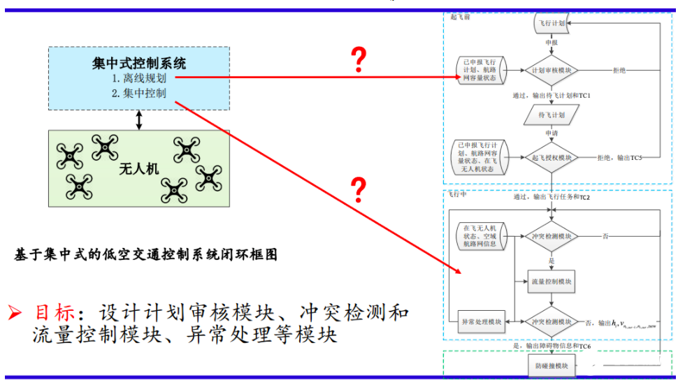 集中式控制可以分为两个部分:离线规划和在线控制。离线规划就是说飞机起飞前需要申报自己的飞行计划,然后接受审核。如果当前的航路网非常堵塞的话,那么审核就不会通过,就需要等待或者重新申报飞行计划。如果审核通过的话,就会产生一个包含起飞时间、地点等信息的待飞计划,将待飞计划写入空中交通管理系统的数据库中,进而对空中交通情况进行预测。