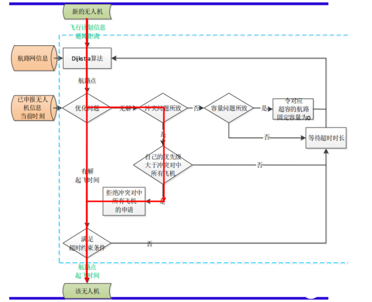步骤五:如果满足超时约束条件,则反馈无人机航路点和起飞时间;否则建议过 ????????????????????时长后执行步骤二。