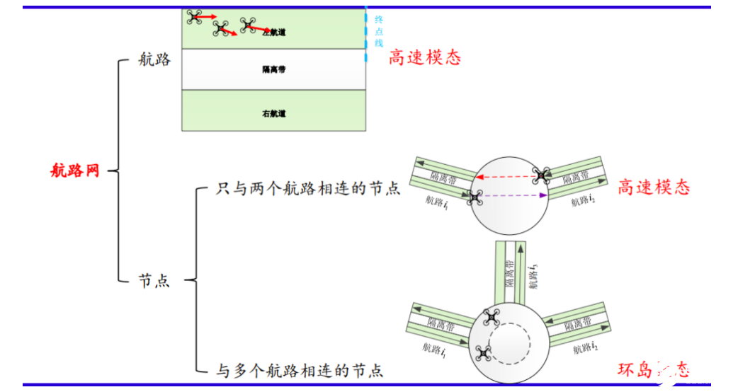 航路网有抽象的结构,内部也有具体的结构,通过一些约束条件,确保不同飞行器在任何情况下都能大于安全距离,这就让我们知道怎样去设计整个航路网。