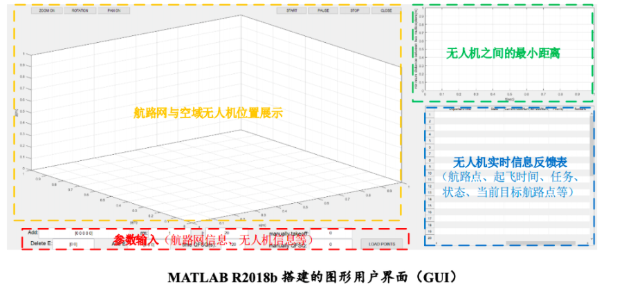 最后来介绍一下我们的仿真,我们自己搭建了MATLAB的一个仿真环境,其中有航路网信息,待审核无人机的信息,输入的禁飞区的信息等等,如下图所示: