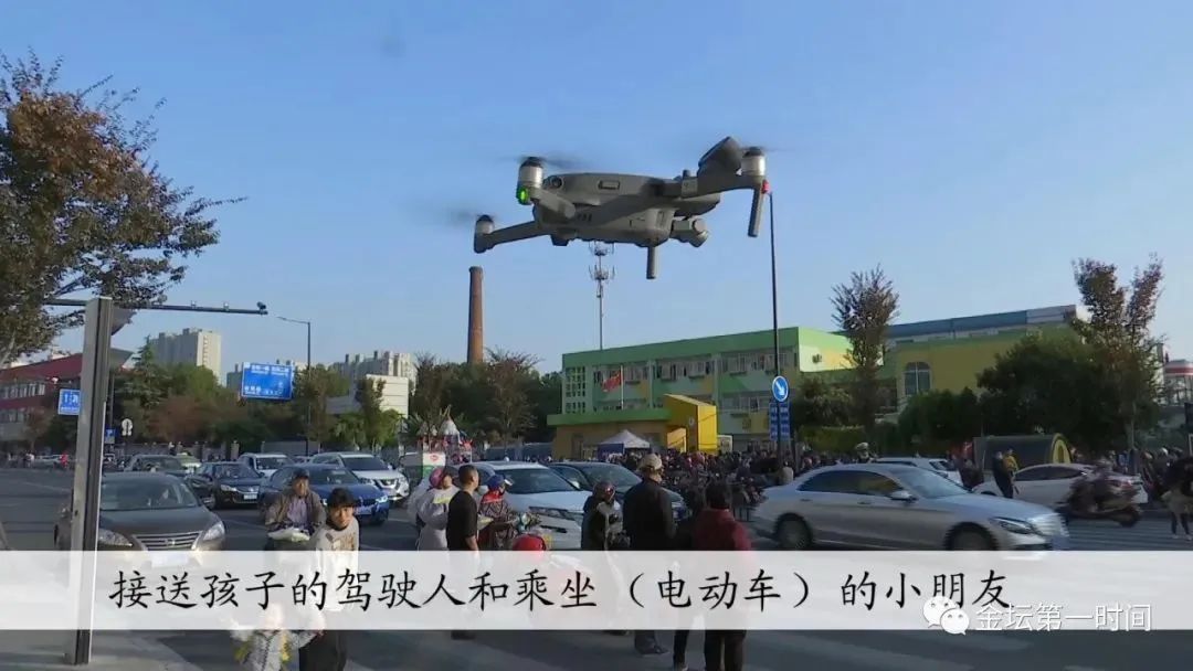 下午3点正是低年级小学生放学的时段,在河滨小学门口,学生和家长们首次听到了天空传来的交警喊话声。