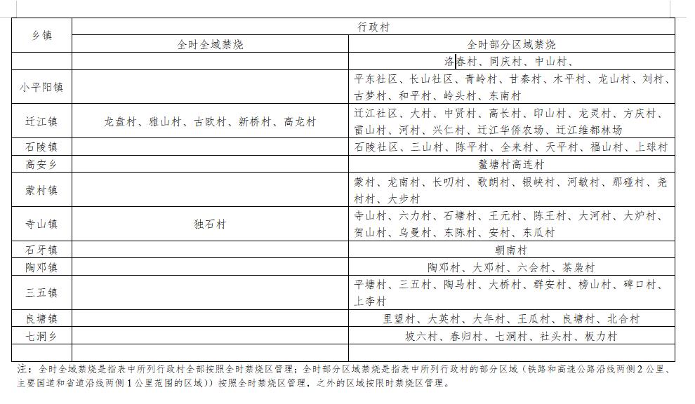 禁烧区分为全时禁烧区和限时禁烧区。全时禁烧区是指相关区域内任何时段都禁止进行秸秆焚烧活动;限时禁烧区是指相关区域内在气象条件允许的情况经过相关部门同意可进行有组织的烧除。