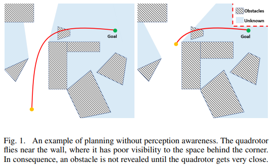 让无人机飞得又快又稳难在哪儿? 近年来,由于轨迹重规划不断取得进展,让四旋翼无人机在未知环境中自主导航已经不是什么难事。然而,大多数方法只适用于中速飞行。是什么阻碍了四旋翼无人机的提速之路?作者总结出了以下几个原因: 1. 在未知的环境中高速运行时,四旋翼无人机需要在极短的时间内重新规划轨迹,以避免撞到障碍物,否则它会坠毁。然而,在非常有限的时间内,大多数方法不能保证快速找到可行轨迹。 2. 目前的方法通常是在一个拓扑等价类中寻找局部最优轨迹,但该类别可能并没有包含平稳、快速飞行所需的最佳解决方案。 3. 现有的方法对环境的感知不足,当飞行速度和障碍物密度变高时,这可能是一个致命的缺陷。如果不注意感知,按照原计划执行的运动可能会遭遇环境能见度受限等问题,进而导致安全航行所需的周围空间信息不足。 图 1 可以更好地说明在重新规划中不考虑感知的后果。为了最小化能量消耗,系统在靠近墙壁的地方生成了一条轨迹。如果沿着这条轨迹飞行,无人机对角落后面未知空间的可见性非常有限,转过去的瞬间才发现障碍物已经近在眼前。然而,此时情况已经难以逆转,无人机可能会直接撞上去。因此,对于无人机的安全、高速飞行来说,积极地观察和避免可能的危险比被动地躲避危险更加关键。