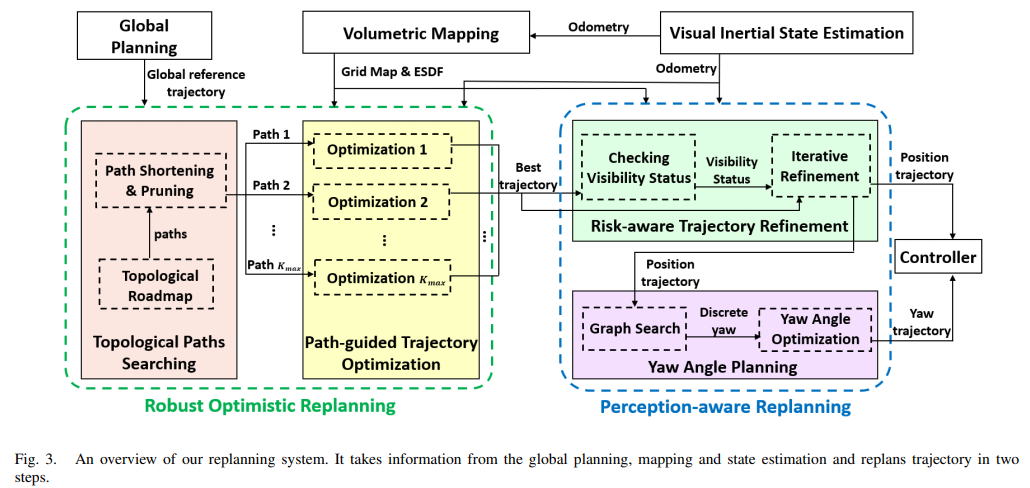 RAPTOR 做了什么? 为了解决上述问题,港科大的研究者提出了一个稳健的 perception-aware 轨迹重规划框架——RAPTOR。 为了确保在有限的时间内获得可行轨迹,港科大的研究者提出了一种基于路径引导梯度(path-guided gradient)的优化方法,利用几何引导路径消除不可行的局部极小值,保证路径重新规划的成功。同时,为了进一步提高重新规划的最优性,该研究还引入了一种在线拓扑路径规划,以提取一组能够捕捉环境结构的全面的路径。在多条不同路径的引导下,多条轨迹并行优化,使解空间得到更彻底的探索。 这一解决方案是在之前的论文《Robust real-time UAV replanning using guided gradient-based optimization and topological paths》中首次提出的。然而,该方法采用了 optimistic 的假设,缺乏对环境的感知意识,因此限制了无人机在更高速度、更复杂的环境中的能力。 为了弥补这一差距,研究人员采用 perception-aware 规划策略将上述方法扩展到更快、更安全的飞行。 首先,该研究提出了一种风险感知的轨迹精化方法,并将其与 optimistic 规划器相结合。利用该方法,沿着 optimistic 轨迹,识别对无人机存在潜在危险的未知区域。这些区域的可见度以及安全反应距离都被明确规定,以确保无人机能够更早地发现未标记区域中存在的障碍并及时躲避。 其次,研究者将无人机的偏航角纳入了两步运动规划框架。在离散状态空间中寻找一个使信息增益和平滑度最大化的最优偏航角序列,并通过优化使其更加平滑。由偏航角规划的运动使视场(FOV)受限的四旋翼无人机主动探索未知空间,为下一步的飞行获取更多相关知识。 本文所提出的重规划系统如图 3 所示。该算法利用全局规划、密集映射和状态估计模块的输出,对全局参考轨迹进行局部修改,以避免先前未知的障碍物。 重规划分两步进行:首先,稳健的 optimistic 重规划通过路径引导优化并行生成多个局部最优轨迹。优化是通过从拓扑路径搜索中提取并精心选择的拓扑独特路径来引导的。在这一步中采用 optimistic 假设。第二步是利用 perception-aware 规划策略。在这一步骤中,局部最优轨迹中的最佳轨迹通过风险感知轨迹精化进一步细化,提高了其在未知和危险空间中的安全性和可见性。在优化轨迹的基础上,偏航角得到规划,以主动探索未知环境的内容。