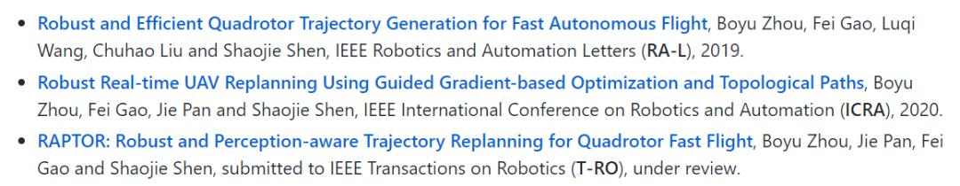 作者简介 本文一作 Boyu Zhou 是香港科技大学 Robotics Institute 的在读博士生,本科阶段就读于上海交通大学。他的研究兴趣包括移动机器人运动规划和密集映射、信息路径规划等。 Boyu Zhou的导师沈劭劼是香港科技大学副教授,同时担任香港科技大学 - 大疆创新联合实验室主任。他 2014 年于美国宾夕法尼亚大学获得博士学位,并于同年加入香港科技大学任教。他的研究兴趣主要集中在机器人和无人机领域,包括状态估计、传感器融合、定位和映射以及在复杂环境中的自主导航。 沈劭劼和他的研究团队曾获 IROS 2018 最佳学生论文奖、SSRR 2016、2015 最佳论文奖等奖项。去年拿到 200 万左右年薪的「华为天才少年」秦通也是沈劭劼的学生。