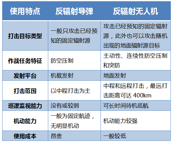 作为当前主要的两型反辐射攻击系统,反辐射无人机与反辐射导弹的主要对比如下所示:
