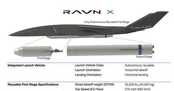 据该公司创始人兼CEO Jay Skylus说,Aevum的模式在基础技术上其实并没有什么新的突破。Skylus此前曾在NASA、波音、Moon Express和Firefly等一系列航天行业家喻户晓的公司和初创公司工作,他表示,这家初创公司主要专注于充分利用现有的现有技术,创建一个大部分可重复使用的全自动小型有效载荷轨道运载系统。Ravn X看起来与现有的喷气式飞机没有太大区别,与已经用于地面无人飞行的Predator系列无人机有明显的相似之处。该飞行器长80英尺,翼展60英尺,包括有效载荷在内的最大总重量为55000磅。目前该系统的70%是完全可以重复使用的。Skylus表示,目标是在此基础上进行迭代,在相对较近的将来,95%的发射系统都可以重复使用。Ravn X的运载系统是为快速反应运载而设计的,能够在短短180分钟内将小型卫星送入轨道----在这之后相当短的时间内就能让它准备好飞行并再次运载另一颗卫星。它使用传统的喷气式燃料,与商业客机上使用的燃料相同。据Skylus公司称,它可以在 “几乎任何天气下”起飞和降落。它还可以在任何一英里长的传统飞机跑道上起飞和降落,这意味着它理论上可以使用世界上任何一个活跃的机场作为发射和降落地点。