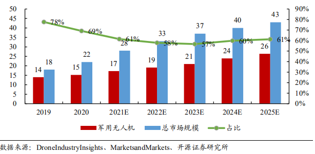 我国军用无人机市场当前体量较小,具备充足增长潜力。2018年我国军用无人机市场规模约为15.94亿美元,2025年预计将达到98.66亿美元,2018-2025年复合增长率约为29.7%。