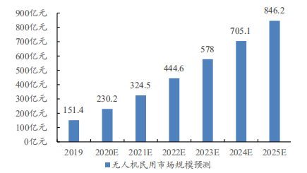 我国消费级无人机市场自2016年以来发展迅速,目前已成为全球最大的消费级无人市场。我国民用无人机市场规模快速上升,2019年其市场规模为151.4亿元,预计2025年将达到846.2亿元,年均复合增长率在33.22%左右。