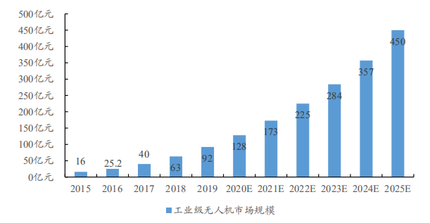 预计到2025年我国工业无人机的市场规模将达到450亿元,其年均复合增长率在39%左右,高于整体民用无人机市场的33%的年均复合增长率,未来市场空间更大。