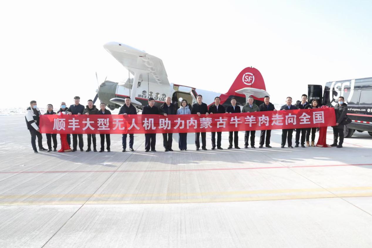 12月08日,在内蒙古鄂托克前旗,顺丰联合内蒙古政府进行大型无人机运输牛羊肉试航仪式,内蒙古自治区邮政管理局局长钟奇志,鄂尔多斯市副市长于仁杰,鄂托克前旗委书记布仁其木格,鄂托克前旗委副书记、政府代旗长吴云,鄂托克前旗委常委、政府常务副旗长都日斯哈拉,鄂尔多斯市交通局局长王水云,鄂尔多斯市商务局局长张涛,鄂尔多斯市邮政管理局局长任海龙,鄂尔多斯市邮政管理局副局长屈涛,以及顺丰集团副总裁兼丰鸟董事长李东起、顺丰速运内蒙古区负责人郑达林等出席了活动。