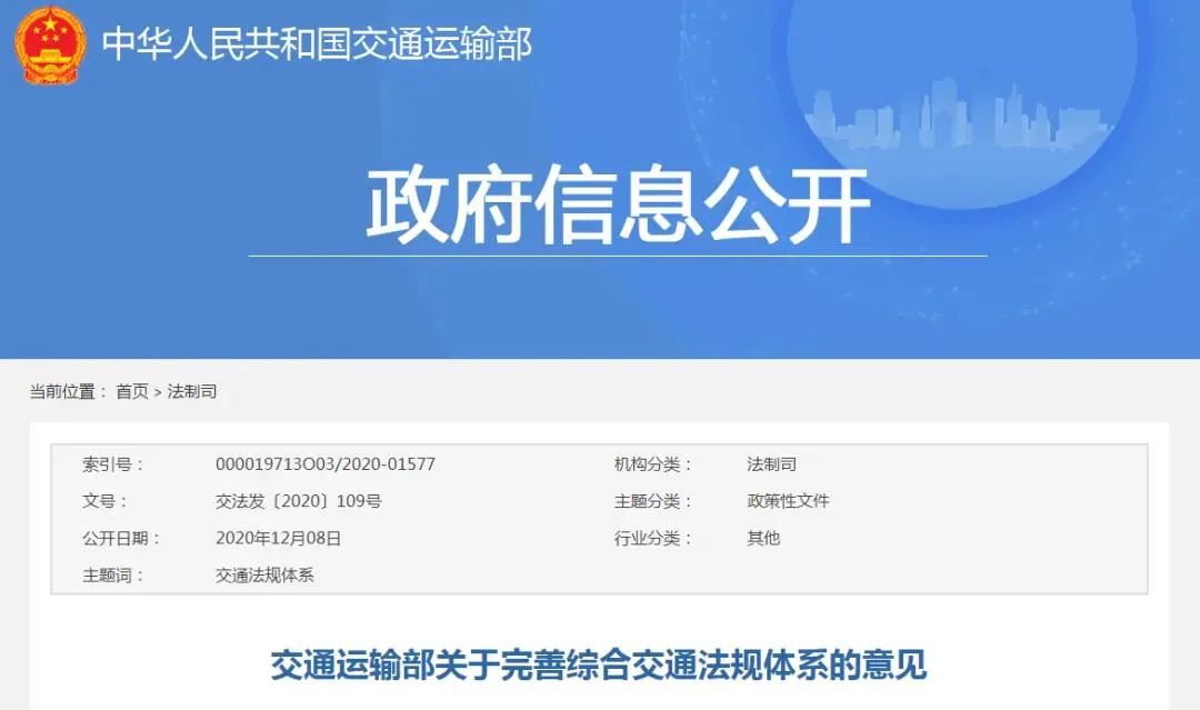 为完善综合交通法规体系,保障和促进加快建设交通强国,交通运输部日前发布《交通运输部关于完善综合交通法规体系的意见》(交法发〔2020〕109号)(以下简称《意见》)。