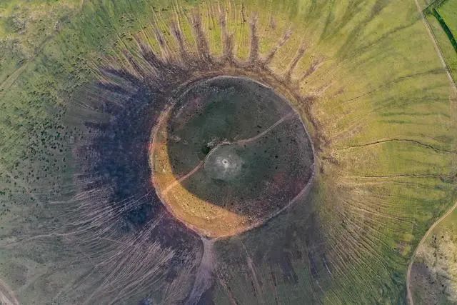 ↑这是在内蒙古自治区乌兰哈达火山群拍摄的一处火山口(7月29日摄,无人机照片)。乌兰哈达火山群位于乌兰察布市察哈尔右翼后旗的草原上。新华社记者 刘磊 摄