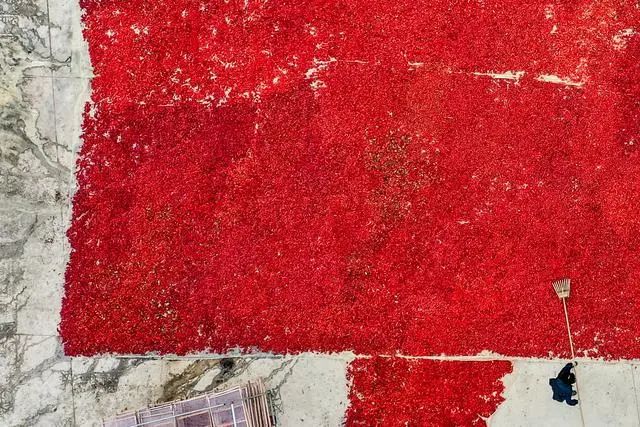 ↑在吉林省白山市靖宇县三道湖镇继红村,农民整理、晾晒刚摘的五味子(9月24日摄,无人机照片)。新华社记者 张楠 摄