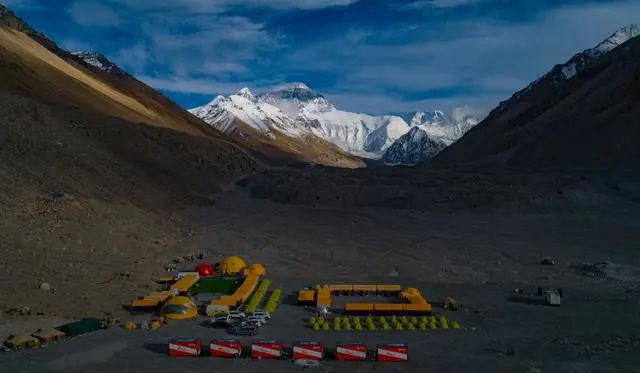 ↑这是5月25日拍摄的珠峰登山大本营及珠峰(无人机照片)。新华社记者 普布扎西 摄