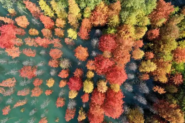 ↑这是在湖北省荆门市漳河水库拍摄的水杉林(11月2日摄,无人机照片)。新华社发(彭琦 摄)