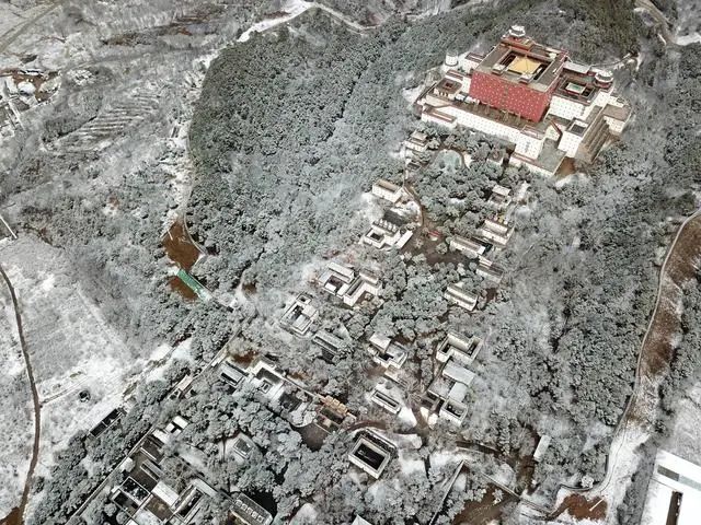 ↑11月19日拍摄的河北承德普陀宗乘之庙雪景(无人机照片)。新华社发(王立群 摄)