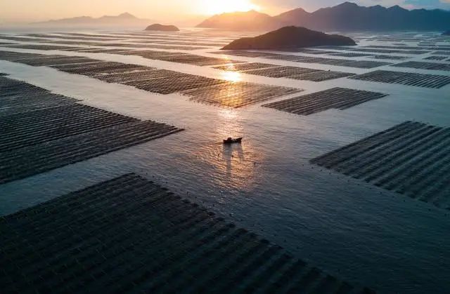 ↑11月26日,在福建省宁德市霞浦县三沙镇,渔船在夕阳余晖中归港(无人机照片)。新华社记者 宋为伟 摄