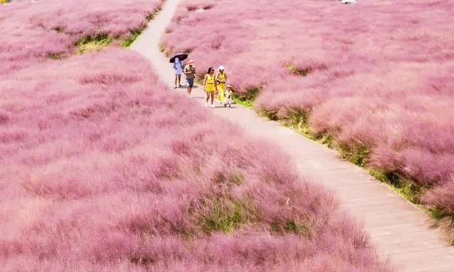 ↑这是贵州省长顺县神泉谷景区内由粉黛乱子草构成的“粉色海洋”(9月2日摄,无人机照片)。新华社记者 陶亮 摄