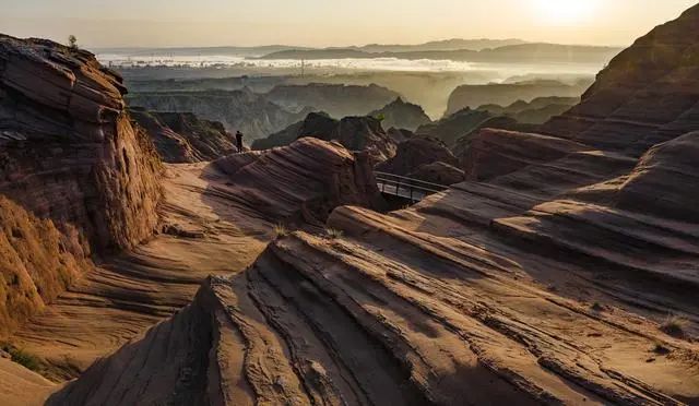 ↑这是陕西省靖边县龙洲镇波浪谷丹霞景区晨景(9月24日摄,无人机照片)。新华社记者 陶明 摄