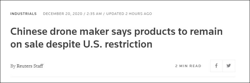 路透社报道截图据路透社20日报道,上周五(18日),大疆被美国商务部列入“实体清单”。对此,该公司的一名代表在一份电子邮件声明中表示:“大疆对美国商务部的决定感到失望,美国的客户可以继续正常购买和使用大疆的产品。”路透社称,正常情况下,当被列入“实体清单”的公司要从美国供应商那里接收货品时,必须从美国商务部申请许可证,这个过程面临严格审查。但这些公司并不被禁止在美国销售产品。今年1月,美国内政部表态称,该部门将停飞约800架中国制造的无人机,在此之前,还停止了对这类无人机的进一步采购。不过,美国国防部却决定继续采购大疆。美国国会议员本月通过《国防授权法案》,法案没有禁止美国机构购买中国无人机技术。当地时间12月18日晚间,美国商务部正式发布公告,以“保护美国国家安全”为由,将共计77个实体列入“实体清单”,其中绝大多数为中国公司、高校或个人,中芯国际、大疆、中国船舶集团等公司在列。路透社表示,特朗普在他任期的最后几周加剧了与中国的紧张关系。在新冠疫情、香港问题、关税贸易摩擦和实体清单制裁等议题上,美国和中国的紧张关系不断升温。《华尔街日报》则在18日的报道中猜测,这可能是特朗普下台前针对中国科技企业的最后一次打击,目的在于巩固其“对华强硬政策遗产”。目前尚不清楚下一任美国总统拜登对此类政策的态度。对于美方针对中企的上述行径,中国外交部发言人汪文斌在18日的例行记者会上表示,这将是美国动用国家力量打压中国企业的又一力证,中方对此坚决反对。