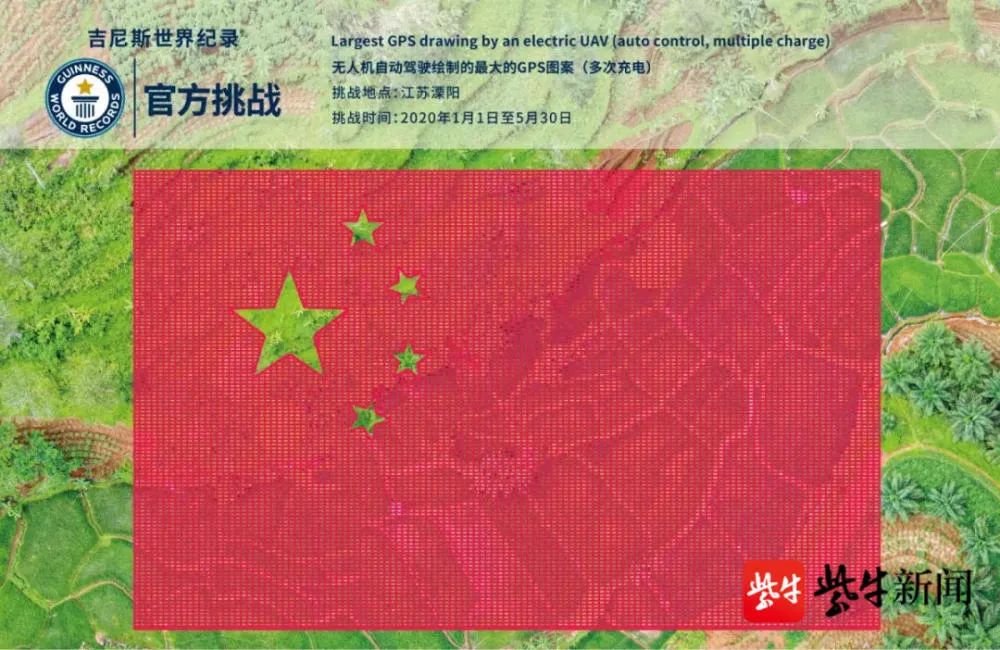 近日,在溧阳汉和航空发布会上,吉尼斯世界纪录官方代表杨邵鹏宣布“无人自动驾驶绘制的最大的中国国旗图案(多次充电)”这一吉尼斯世界纪录正式达成:“经过之前5个月的挑战,以及对挑战过程和数据结果的认证,确认最终组成图案的航行距离是5020.92公里。我谨代表吉尼斯世界纪录宣布:恭喜你们挑战成功!”