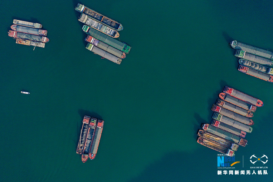 2020年2月,受疫情影响,三峡库区实行禁航,各类游船和乡镇班船静静停泊在巫山港口,三十多只长江货运船舶也在巫山港静待三峡船闸放行的信号。新华网发(朱云平 摄)