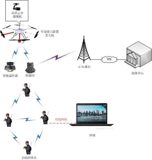 本次培训演练通过慧明捷无人机巡查系统,用无人机作为现场图像传输,六旋翼专业级无人机作为载体,实现空中拍摄高清图像并传输回地面站,通过无人机高空拍摄的画面可直观辨别情况、及时提出解决方案。自组网设备可实现自动组网,多跳传输功能,在培训中,演示4台自组网设备通过多跳传输,将3路图像清晰的回传至终端设备。具体应用方式示意图如下所示: