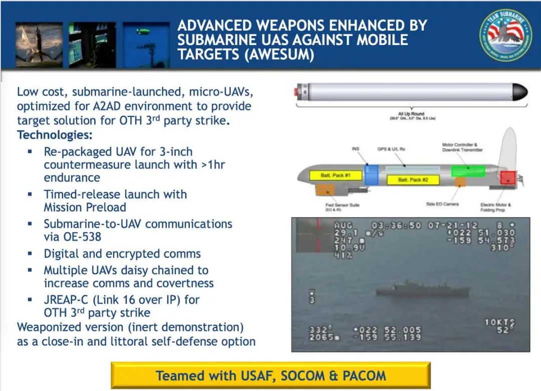 “将潜艇部署的无人飞机视为飞行潜望镜,能够显着扩展潜艇的有机传感器范围,向潜艇或联合部队提供目标质量的传感器数据,并实现鱼叉和海上战斧导弹的打击”美国太平洋舰队潜艇部队指挥官海军少将布雷克匡威表示,在一个单独的在线洽谈为海军潜艇联盟研讨会的一部分。“我们一直在进行战术发展演习,以提高现有潜艇传感器的性能并确定需要改进的领域,以便我们能够在敌方见到我们之前就及时发现敌方,然后我们就可以先将其射杀。”