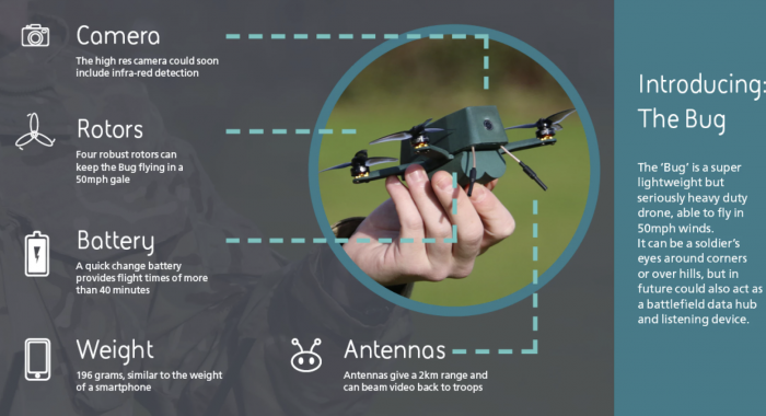 无人机公司UAVTEK与BAE系统公司合作,向英国陆军交付了30架 "Bug"微型无人机原型机,用于实地评估。这种无人机重6.91盎司(196克),设计可在高达50英里/小时(80公里/小时)的风速下运行。"Bug"微型无人机原型的重量和智能手机差不多,续航能力为1.25英里(2公里),电池寿命为四十分钟。它可以达到80公里/小时(22米/秒)的速度,将视觉传回多个设备,并能应对35节的风速,最高可达45节,据BAE公司介绍,在最近英国举行的陆军作战实验(AWE)活动中,它是唯一能度过恶劣天气的无人机。