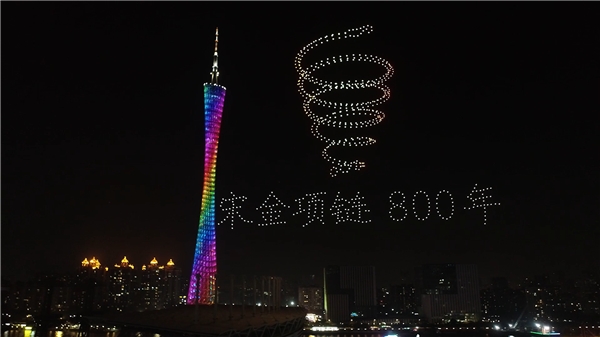 2021年1月2日夜,两座“小蛮腰”在夜色中“同框”的画面,震惊了不少广州市民,紧接着,各种瑰丽的“宝藏”画面接连绽放夜空。构成这些奇幻画面的,是一千架带着灯光升空的无人机。而在这场由水井坊与其独家冠名赞助的《国家宝藏》第三季联袂奉上的表演中,除了惟妙惟肖的“小蛮腰二号”外,最吸引广东市民关注的,无疑是来自广东省博物馆,曾登上国家宝藏节目舞台的“800年宋金项链”。