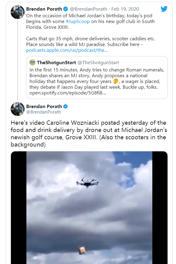 想知道迈克尔·乔丹如何获得在高尔夫球场上进行无人机交付的许可吗?鉴于他似乎并没有与Flight Forward、Wing Aviation或Amazon Prime合作(美国仅有三家拥有135部分证书的无人机公司进行无人机交付),我们猜测这是在驾驶员视距内进行的无人机交付(VLOS)。