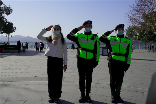杭州网记者(左一)和女子巡逻队员一起敬礼,向中国人民警察节致敬