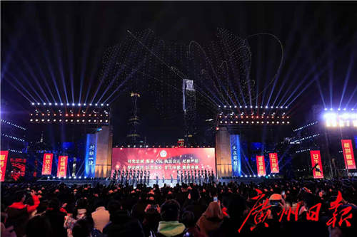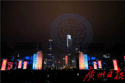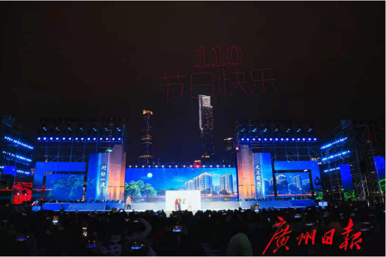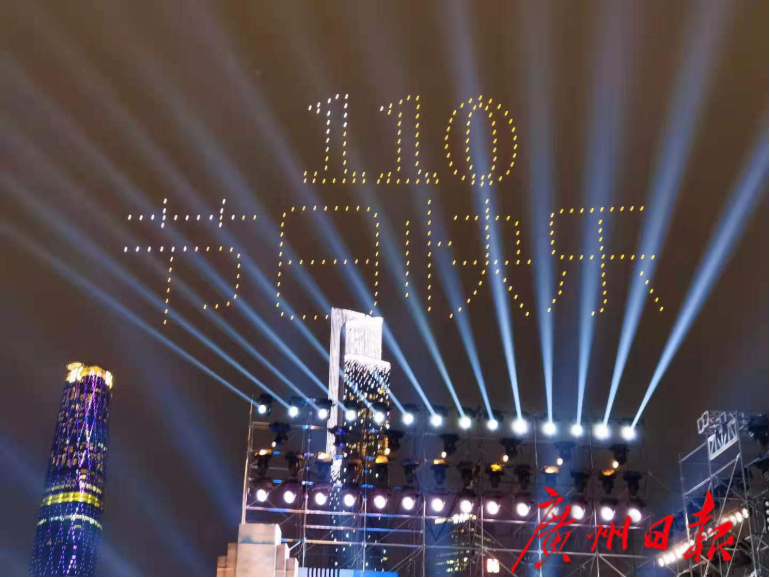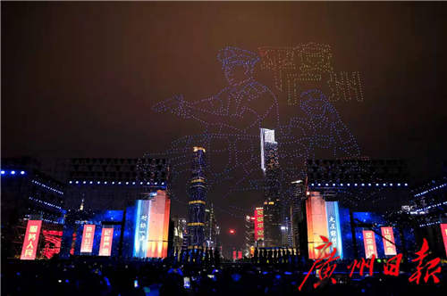随后,在晚会结束之际,第二组1986架无人机再次升空,代表于1986年广州始创的110报警服务台,形成“首届中国人民警察节”、“广州公安”、“警旗”、“广州11035周年”等多组图案,助力晚会压轴表演。