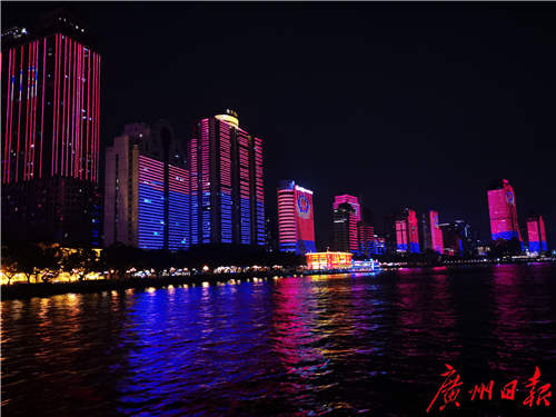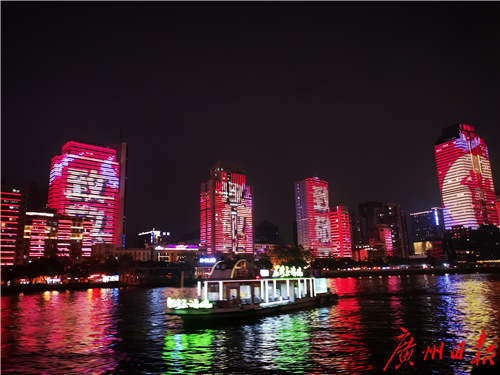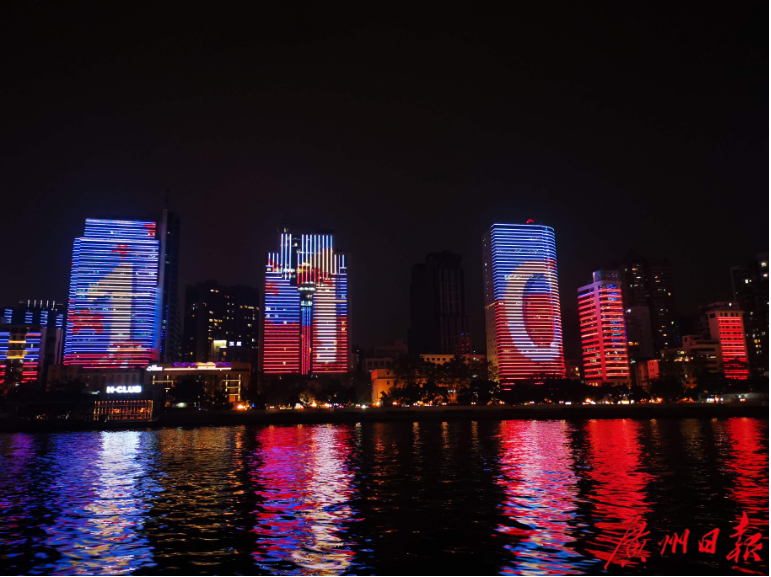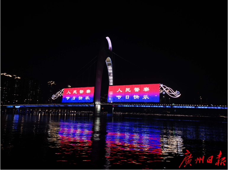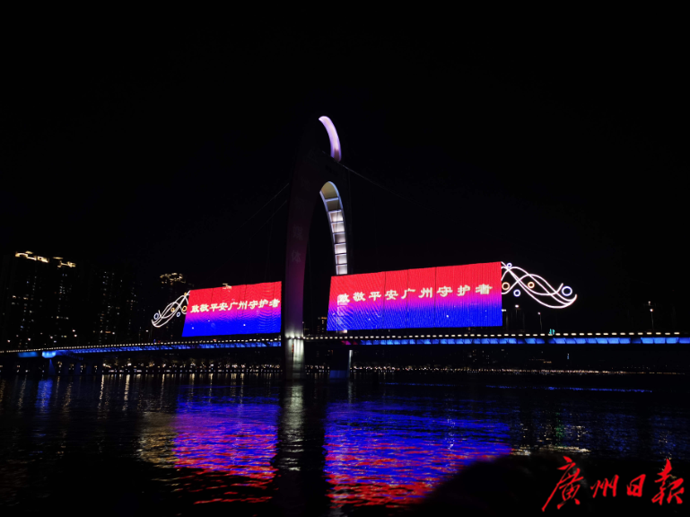 当晚,珠江一江两岸三桥(分别是珠江夜游游船、两岸24栋楼宇数字媒体幕墙、海珠桥、海印桥和猎德桥)上演“红蓝”光影秀,看上去就像穿上了“警服”一般,广州塔、海珠广场户外大屏等地标也同步亮灯,通过全市多地同时展播广州公安公益视频及警察节祝福标语,表达节日祝福和向平安广州守护者致敬。