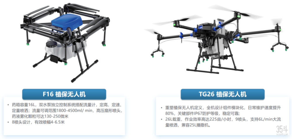 这个是我们最近两年出的一些产品(如图4所示),前面是F16植保无人机,2020年它的销量达到几千台。另外一款是TG26 植保无人机,它的药箱容量是26L,作业效率高达225亩/小时。这台无人机配备了9个喷头,支持6L/min大流量喷洒,兼容25L的播撒机。近日正在全国各地做推广演示。我们给它的定位不仅是植保无人机,更重要的是一个多功能的农用无人机平台。它的药箱部分可以快速插拔,换成不同的功能套件。如果换成播撒机就可以进行施肥、播种、虾蟹饲料播撒。我们还在测试使用这个平台进行农产品的短距离运输。