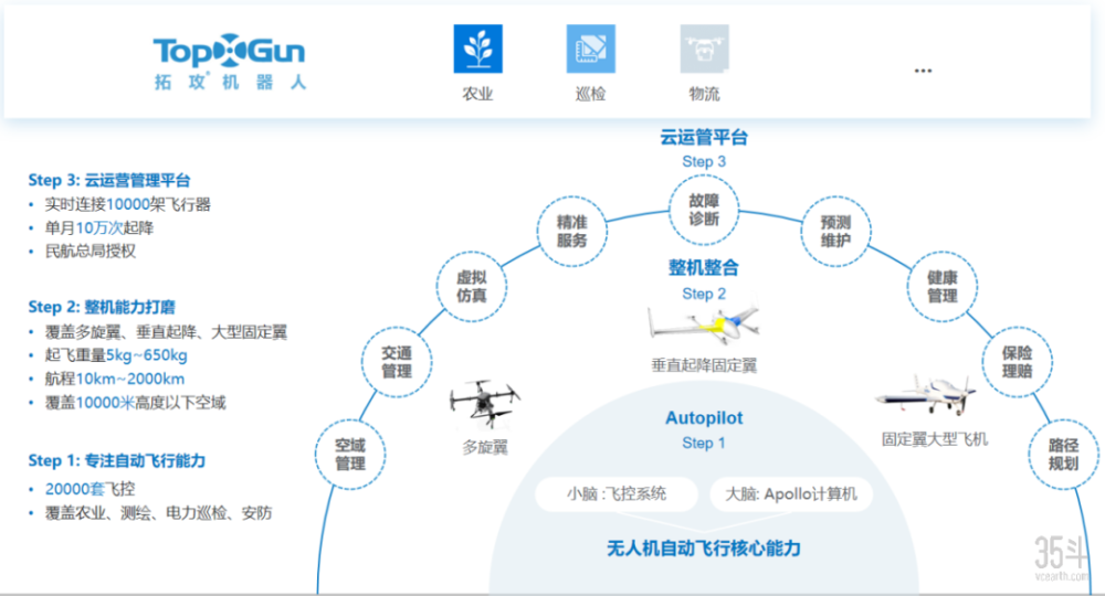 Step 1: 专注自动飞行能力:拓攻技术围绕无人机智能驾驶,覆盖农业、测绘、电力巡检、安防等方面。我们在行业里第一个提出大脑和小脑概念,小脑确保任何时候飞机都能安全飞行,大脑确保无人机有智能执行各种各样的任务。