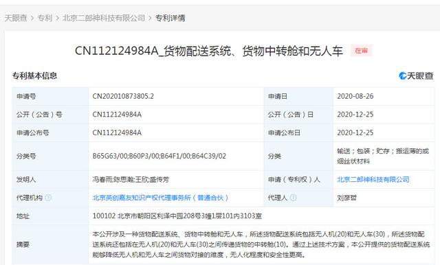此后,美团全资子公司北京二郎神科技有限公司在2020年12月25日公开了“货物配送系统、货物中转舱和无人车”相关专利。