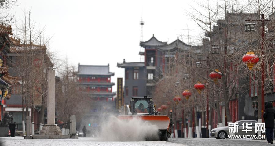 一辆除雪车在沈阳故宫外的街道除雪