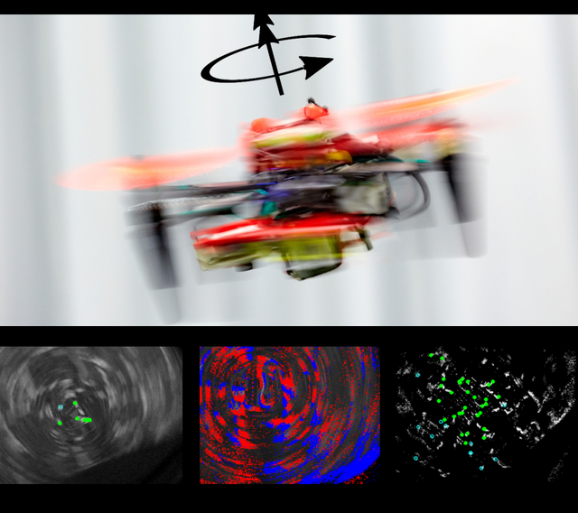 研究人员为他们的四旋翼飞行器配备了两种摄像头:标准摄像头和事件摄像头,前者以固定速率每秒记录几次图像,后者基于独立的像素,这些像素只有当它们检测到到达它们的光线变化时才会被激活。研究团队开发的算法结合了两个传感器的信息,并利用它来跟踪四旋翼飞行器相对于周围环境的位置。这使得机载计算机能够在只有三个旋翼的无人机飞行以及自旋时控制它。