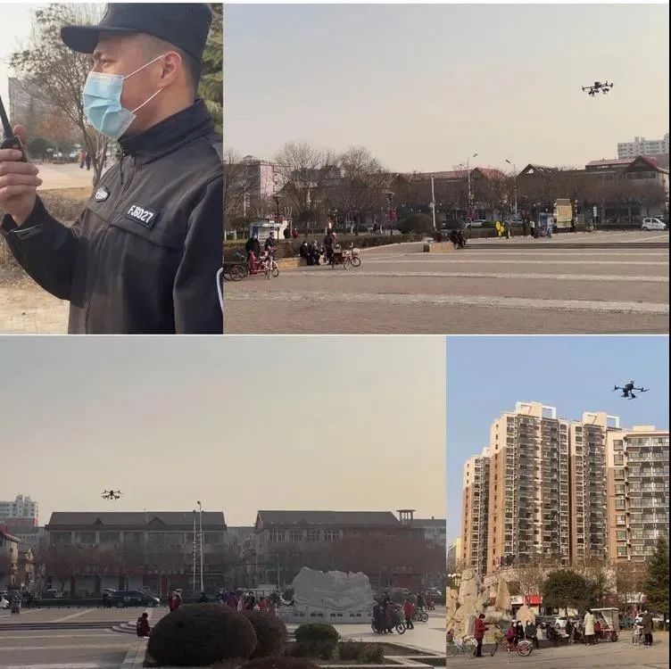 无人机上挂着喇叭宣传疫情防控知识,没有噪音干扰,能够确保宣传全方位,不留死角、不留盲区。哪里是人员密集区域,就飞向哪里宣传,大大提高了巡查和防范宣传工作效率。